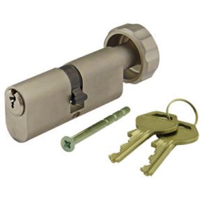 This is the ISEO Euro Single Thumbturn Cylinder which uses a round thumbturn. No keys as this just a thumbturn only cylinder. It still uses an adjustable cam if relocating the cam is required.