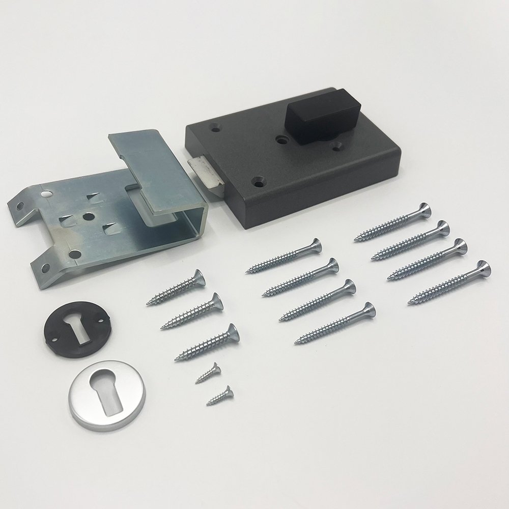 The latch is withdrawn with the key from the external side of the door and a turn knob from the inside.
