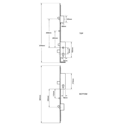 Fuhr stable door multipoint door locks feature two gearboxes. The top section is a split spindle, and the bottom section is key wind. Both gearboxes feature a deadbolt which throws 20mm. The gearbox measures 220mm x width + 18mm. The latch (top section only) and deadbolt are both 31mm high and there is 61mm between the bottom of the latch and the top of the deadbolt. Gearboxes are fixed to faceplates with 3 screws. The distance from the top screw to the middle screw is 91mm and the distance from the middle to bottom screw is 108mm.