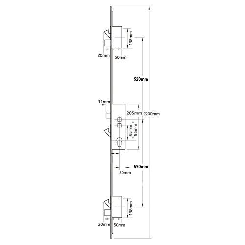 The second generation Millenco Mantis lock features 65/95mm centres and is available in 2 variations. This lock features 550mm hook centres and is normally used on the master door in a pair of French doors.