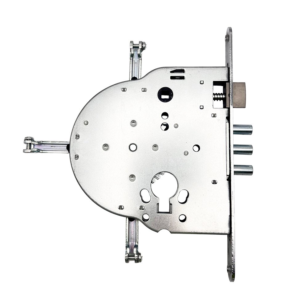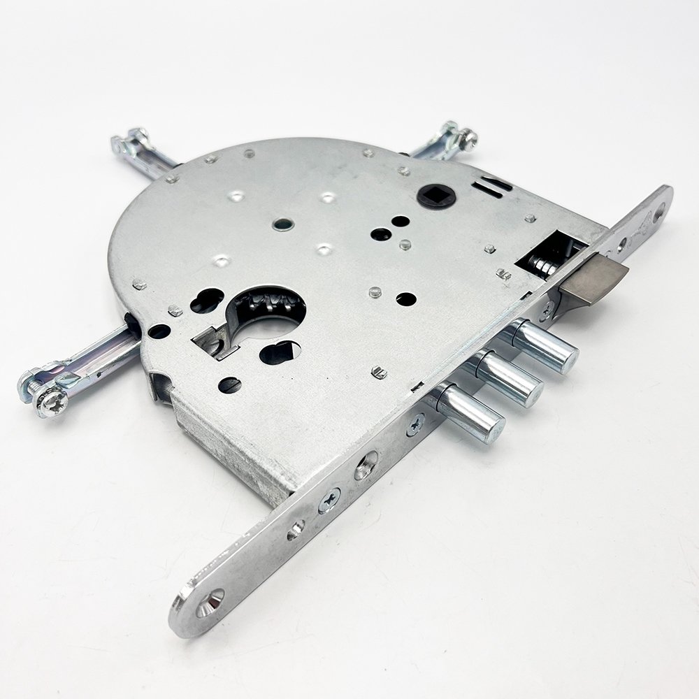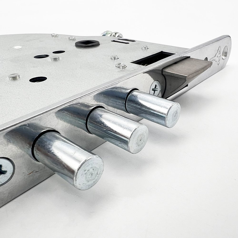 The Mut-T-Lock 4-Way Locks (235, 265) can be installed inside wood or metal doors to provide 4-way multi-bolt locking. Very common on high security commercial doors these centre locks connect to vertical and horizontal shootbolt extentions to offer 4 way locking and a very high security solution. These locks feature Key Wind operation requiring Mu-T-Lock cog cam type cylinder. The key can also retract the latch, but lever handles are also available to suit these locks (Mul-T-Lock SH300 type furniture)