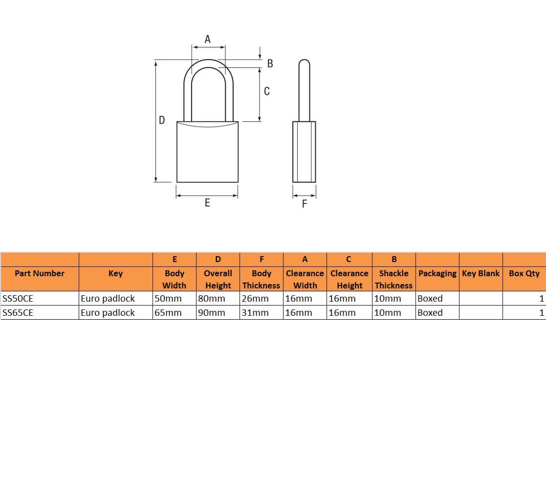 Squire’s E version of the Stronghold accepts half euro cylinders to allow it to be incorporated into masterkey systems. Close shackle in 50mm or 65mm body width.