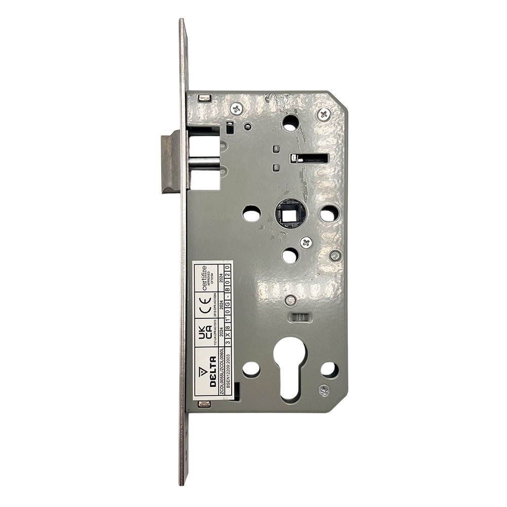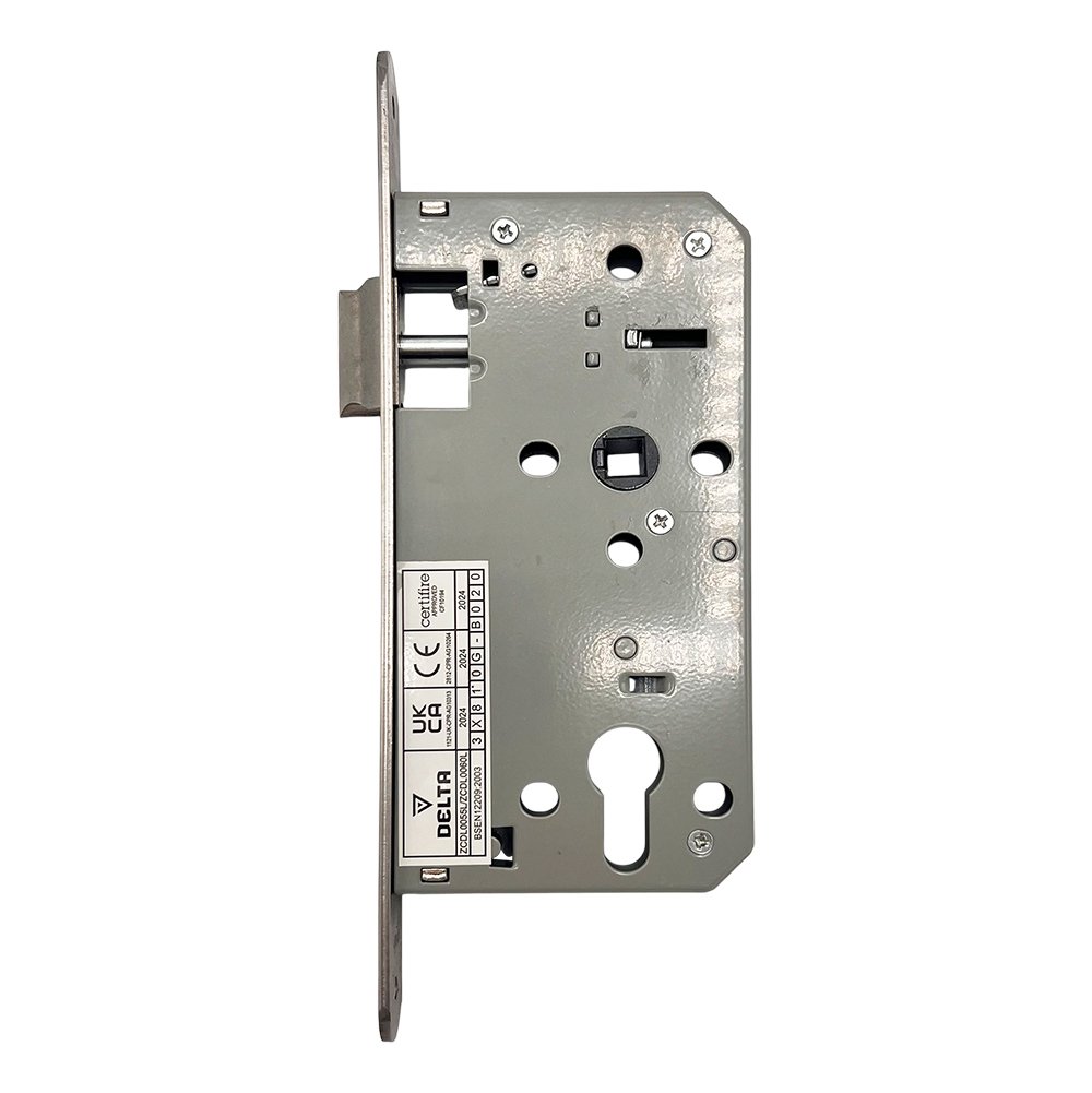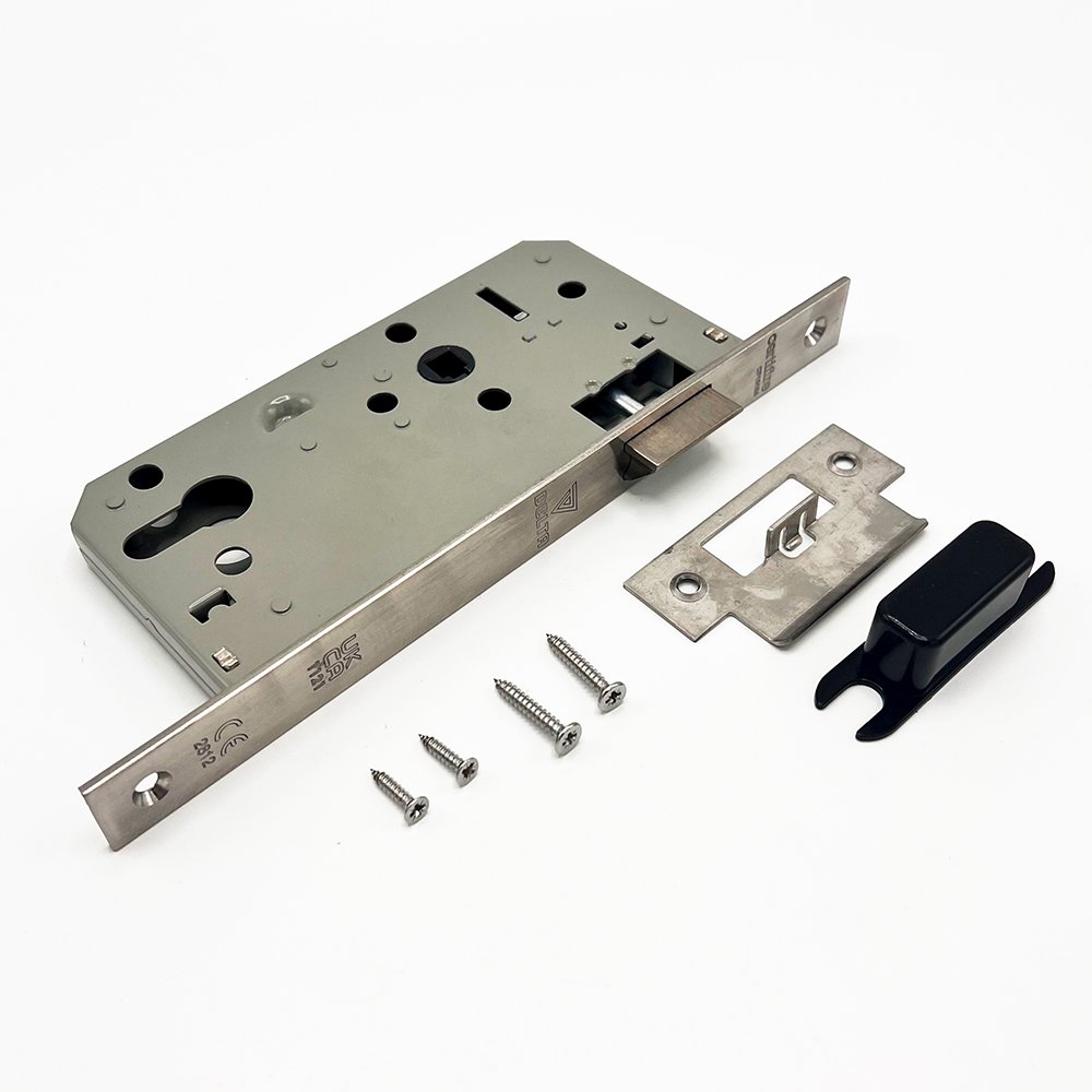 Zoo DIN Euro Mortice Latch Case is a DIN standard mortice lock. This Upright lock case offers basic latch functionality only. The lever retracts the sprung latch bolt. The Euro cylinder piercing is redundant and offers no cylinder operated functionality. It exists only as the same case sideplates are shard by the other DIN locks in the series.